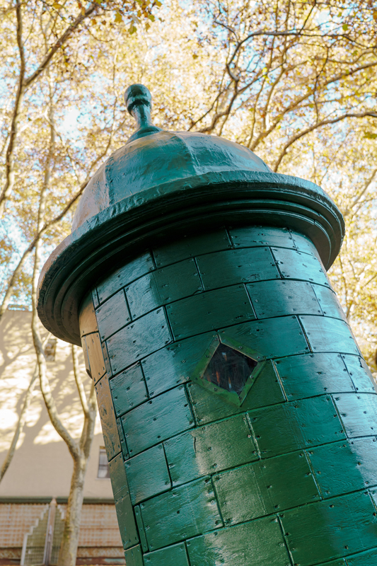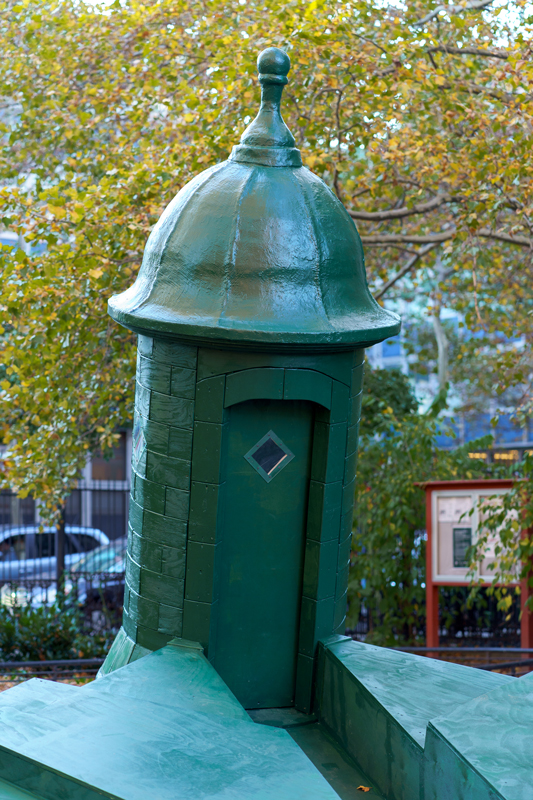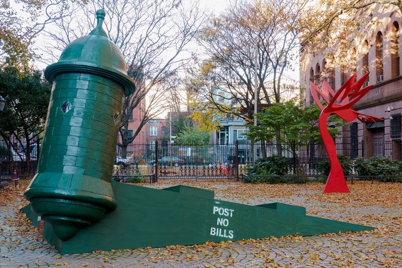 For centuries, and still...(anticipated completion) recreates a guard tower (or garita, in Spanish) from the iconic colonial fortresses of Old San Juan, built out of NYC construction fencing material. Echoing the hastily painted green plywood walls, paint sprayed “Post No Bills'' stencils, and everyday interventions such as buffed out graffiti and commercial posters, these elements represent a NYC visual language, which creates a visually specific link to Puerto Rico, its colonial legacy to the US, and the history of migration between both locations.